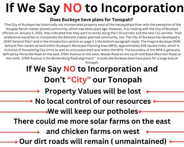 Helping to give the community of Tonopah an opportunity to vote for the incorporation. Currently the town is unincorporated and does not have any local decision making ability or the ability to control and shape its future. Decisions that affect the Tonopah community are made 50 miles away at the Maricopa County Board of Supervisors, Sheriffs Office, Air Quality Department, Planning & Development, and Transportation